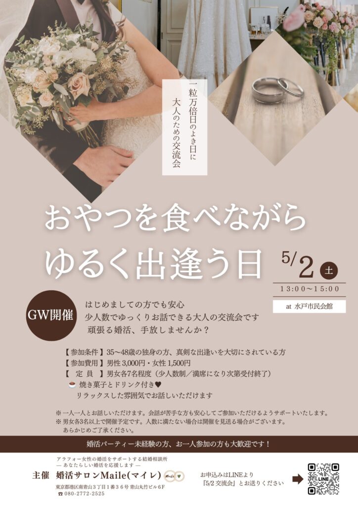 - 2026-03-21ブログ頑張らない婚活、はじめませんか?水戸で少人数の婚活パーティーを開催します☕🌿